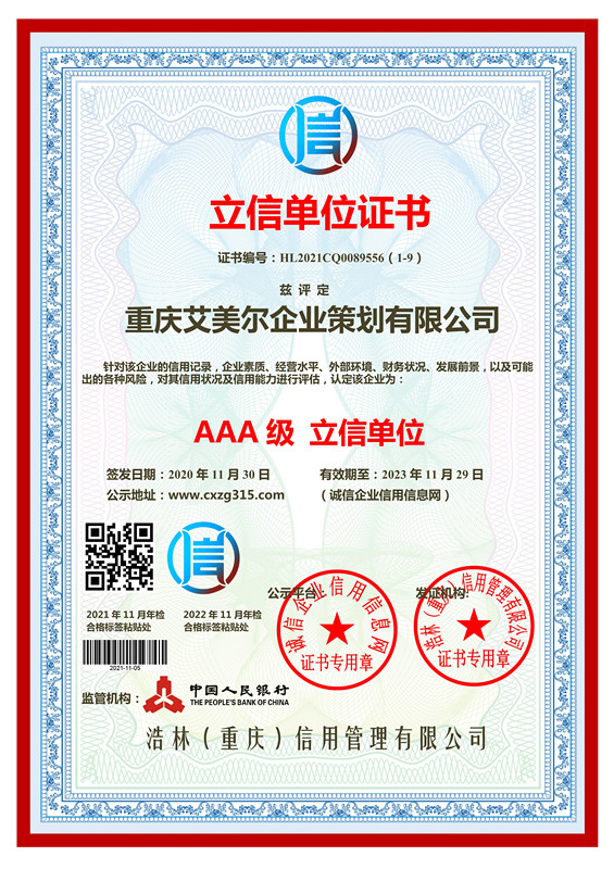 重庆PA直营企业策划有限公司被被评级为立信单位,艾美策划核心策划项目:重庆企业策划,重庆企业策划公司,重庆招商策划,重庆企业宣传片,艾美策划 使命必达