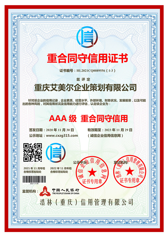 重庆PA直营企业策划有限公司被被评级为重合同守信用单位,艾美策划核心策划项目:重庆企业策划,重庆企业策划公司,重庆招商策划,重庆企业宣传片,企业VI设计,商业计划书,艾美受托 使命必达。
