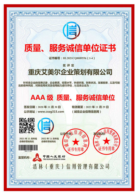 重庆PA直营企业策划有限公司被被评级为质量服务诚信单位,艾美策划核心策划项目:重庆企业策划,重庆企业策划公司,重庆招商策划,重庆企业宣传片,企业VI设计,商业计划书,艾美受托 使命必达。